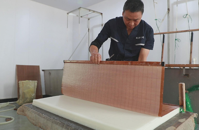 徽州傳統(tǒng)手工楮皮紙,采用傳統(tǒng)手工抄紙工藝,經(jīng)過27道工序,以手工精細制作而成,產(chǎn)品主要有楮皮紙、云龍紙、皺紋紙、落水紙、棉紙、版畫、攝影畫、手撕畫專用紙。